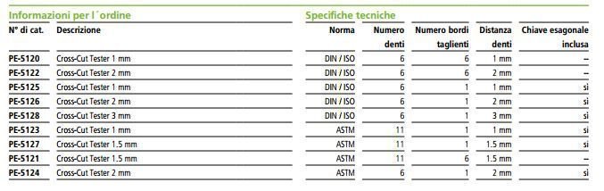 Il metodo ASTM D 3359 richiede 11 linee di taglio: cutter da 1 mm per film fino a 50 µm di spessore cutter da 2 mm per film tra 50 e 125 µm di spessore. Lo standard ISO prescrive che il numero dei tagli debba essere 6, e che la distanza tra i denti debba essere in funzione dello spessore e del tipo di vernice come di seguito mostrato: