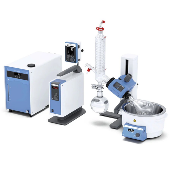 Il Kit RV 3 pro V Complete di IKA è composto da evaporatore rotante, bagno riscaldante HB Eco, condensatore verticale in vetro ad alta efficienza, pallone evaporatore, pallone di raccolta, pompa da vuoto, controllo del vuoto e chiller.
