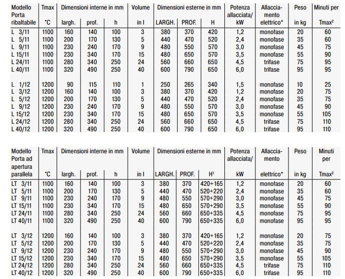 - Temperatura massima 1100 °C o 1200 °C