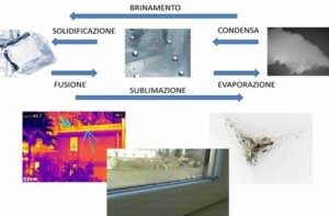 LA CONDENSA è il passaggio di una sostanza dallo stato di vapore a quello di liquido per sottrazione di calore. La condensa si crea nel momento in cui il vapore è saturo, ovvero in equilibrio con il proprio liquido, tanto maggiore sarà la temperatura dell’aria tanto più alta sarà la sua capacità di assorbire vapore, avremo quindi un innalzamento dell’umidità relativa cioè della percentuale di vapore acqueo contenuto nell’acqua. La misura viene effettuata con un igrometro che può essere per materiali specifici o con sensore infrarosso.